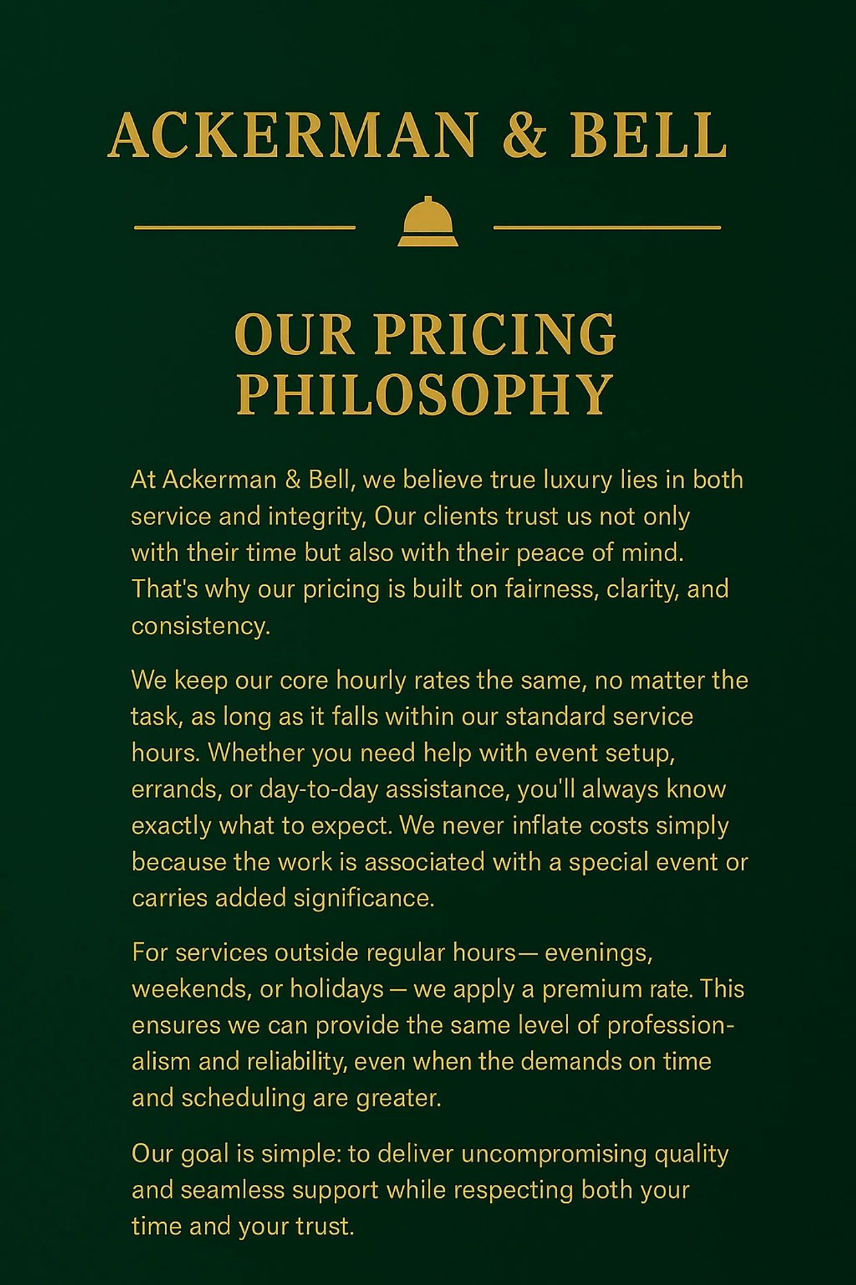 At Ackerman & Bell, our vision is to redefine personal assistance as a true luxury — not through excess, but through integrity, discretion, and excellence. We believe that peace of mind and the freedom to focus on what matters most are the ultimate forms of wealth. Every detail we handle is guided by this philosophy.